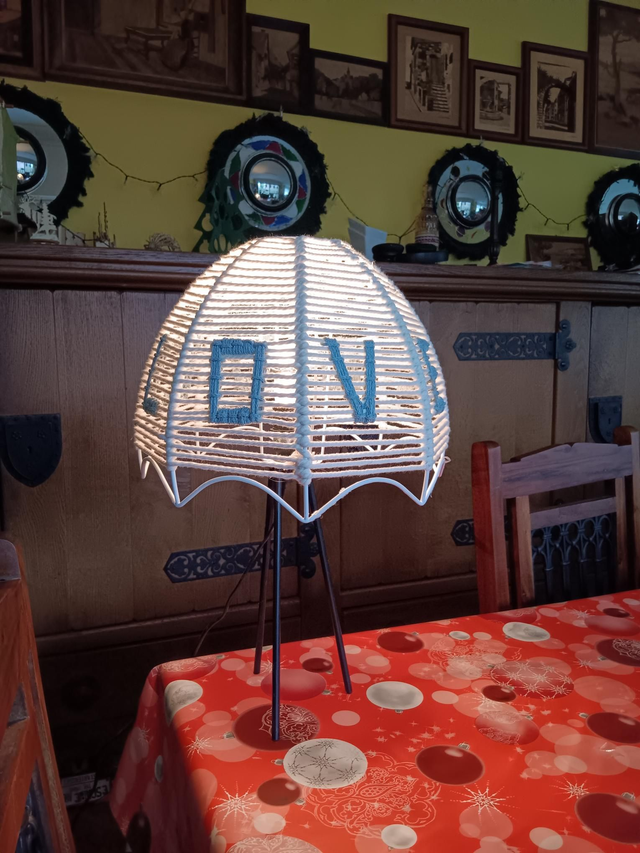 Deze lampenkap is met de hand geknoopd en de gekozen naam wordt erop geknopt.